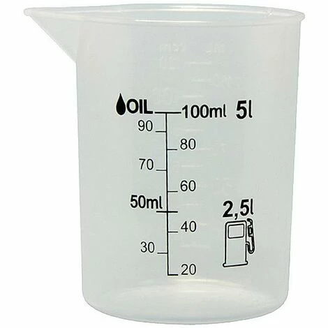Kleiner, universeller Messbecher mit Feineinteilung und Spezialskalierung für 2-Taktmischungen