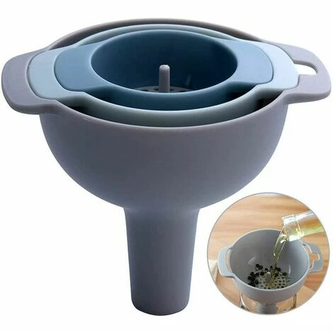 Kreatives Design – 4-in-1-Trichter in drei Größen + abnehmbarer Filter. Beidseitige Griffe und sehr praktisch in der Handhabung, leichter als Edelstahltrichter, flexibler, einfacher zu reinigen, aber genauso langlebig und widerstandsfähig.