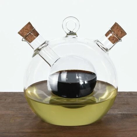 Bring some magic into your kitchen! Eine einzigartige Flasche für Öl und Essig ist eine originelle Ergänzung der Kücheneinrichtung, dank der gewöhnliche Lebensmittel Teil einer interessanten Dekoration werden. Die faszinierende Form der Schale erinnert an ein alchemistisches Gericht oder ein Stück alter Küchengeräte. Die Flasche passt perfekt zur Retro- oder Rustikalküche. Aber auch in der modernen Küche wird es die Aufmerksamkeit der Gäste auf sich ziehen. Zwei Glaskugeln, die ineinander gesteckt werden, können mit jeder beliebigen Flüssigkeit gefüllt werden – Weinessig, Balsamico-Essig, Olivenöl oder anderem. Der flache Boden bietet Stabilität für das Gefäß, und Korkenstopfen schützen den Inhalt vor Witterungseinflüssen. Die Flasche schmückt nicht nur die Küche – sie spart auch Platz in einem kleinen Schrank oder auf der Küchenzeile. Es wird auch dazu beitragen, nicht immer ästhetische Werksverpackungen von Produkten zu ersetzen.
