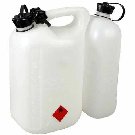 für Benzin, Diesel und E10 geeignet. Kraftstoffkanister (5 l). mit separatem Ölbehälter (3 l). inklusive Auslaufrohr. für den Betrieb von Kleinmotoren in Motorsägen, Rasenmähern etc.. transparent. mit UN-Zulassung nach GGVS Nr. 3H1W?/?Y1.OZ1.0?/?150/13.