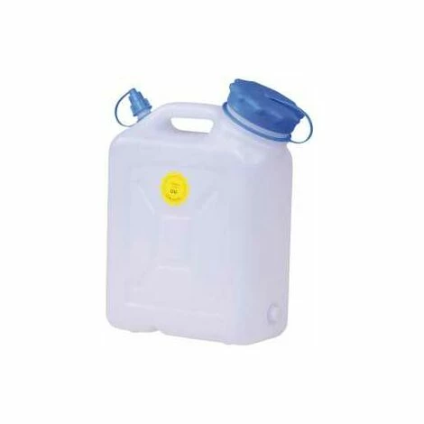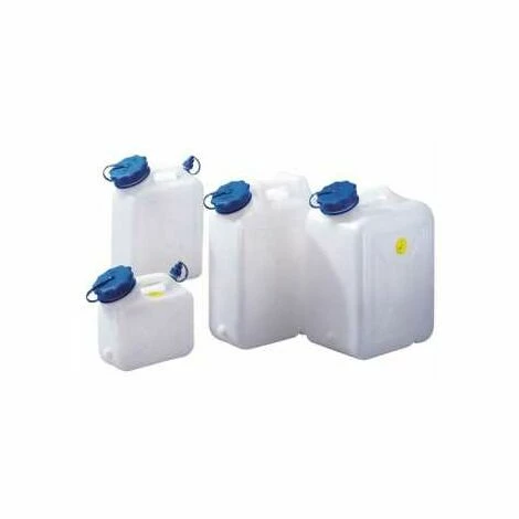 Weithalskanister•Polyurethan•Mit UV-Schutz•Säurefest und lebensmittelbeständig•Große Öffnung Ø 88 mm zur Innenreinigung von Hand•Mit Gewinde und Stopfen auf Schmalseite•Anschluss von Eckventilen möglich* Ausführung: zusätzlich mit kleinem Ausguss Ø 18 mm (5 + 10 L) | Eigenschaften: Inhalt: 10, Öffnungs-Ø: 88 + 18, Breite: 302 mm, Tiefe: 154 mm, Höhe: 397 mm, Material: HD-PE, Farbe: natur
