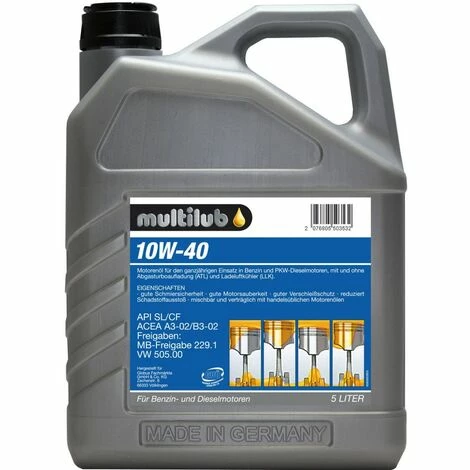 Das Motorenöl Multilub 10W-40 ist ein Ganzjahres-Leichtlauf-Hochleistungsöl moderner Formulierung mit Synthese-Komponenten. Es eignet sich hervorragend für den Einsatz in Benzin- und PKW-Dieselmotoren, mit und ohne Abgasturboaufladung (ATL) und Ladeluftkühler (LLK).Inhalt: 5 lfür Benzin- und Dieselmotorenleichter Motorlaufschnelle Ölversorgung bei tiefen Temperaturensorgt für gute Schmiersicherheit über den gesamten Temperatureinsatzbereichoptimale MotorsauberkeitAbgaskatalysator und Turbo getestetmischbar und verträglich mit allen handelsüblichen Motorölenguter VerschleißschutzFreigaben: ACEA A3,ACEA B4,API SM,MB-Freigabe 229.3,VW 501 01,VW 505 00Empfehlungen: MB 229.1