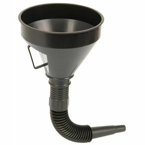 Schwarzer Kunststofftrichter mit abnehmbarem Auslaufschlauch und feinem Sieb, dadurch ideal zum Einfüllen und Filtern von Kraftstoffen, Ölen, Farben usw. Maße: Durchmesser 140 mm, Länge ohne/mit Auslaufschlauch 175/380 mm.