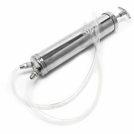 Der Öl-Sauger aus Stahl hat die Abmessung: ~ 78 cm Länge und ~ 5,5 cm Ø; das Volumen beträgt 1450 ml. Kugelventile verhindern im Innern den Flüssigkeitsrücklauf.